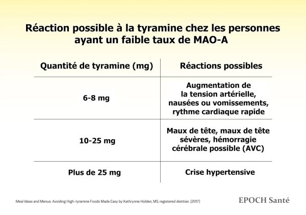 La sensibilité à la tyramine survient lorsque le corps ne parvient pas à décomposer correctement la tyramine, faute de niveaux suffisants de l’enzyme monoamine oxydase-A (MAO-A). Cette carence enzymatique peut déclencher des symptômes comme des pics de pression artérielle, des palpitations cardiaques, des nausées, des migraines et de l’anxiété. Des niveaux faibles de MAO-A peuvent être d’origine génétique ou liés à des médicaments. Les migraines chroniques sont également fréquentes. Les symptômes apparaissent généralement 1 à 12 heures après avoir consommé des aliments riches en tyramine.