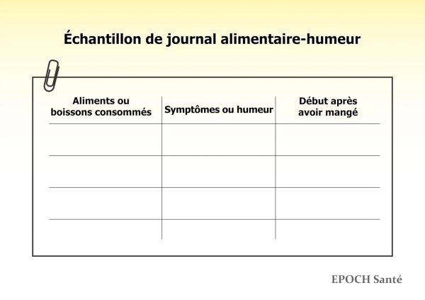 • Indiquer l’humeur et tous les symptômes ressentis (comme des maux de tête, des nausées, de la transpiration, un rythme cardiaque rapide ou de l’anxiété). Les réactions aux composés alimentaires sont souvent retardées de plusieurs heures.