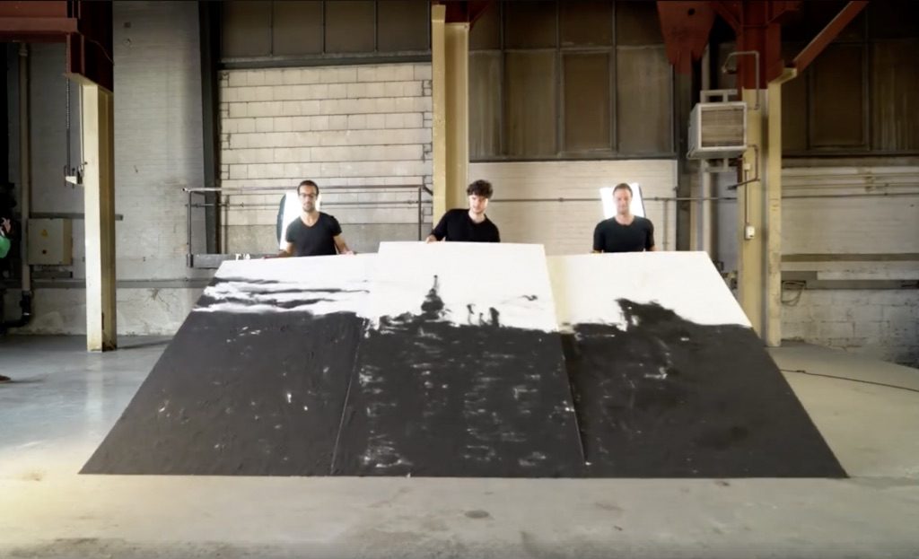 Le point culminant de la vidéo arrive à la fin lorsque Bengel et son équipe soulèvent trois grandes toiles, et que l’excès de sable glisse pour révéler une peinture époustouflante d’une ville emblématique. C’est magique !