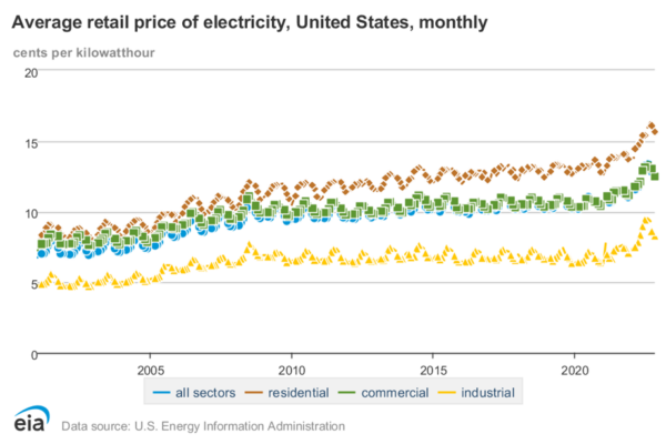 Le marché américain de l’électricité a permis d’offrir aux consommateurs des prix inférieurs à ceux de la France et leur augmentation de 2000 à 2020 a été en moyenne (tous secteurs confondus) de l’ordre de 35% ainsi que l’indique ce tableau de l’EIA sur les prix de détail mensuels de l’électricité de 2000 à 2020 :