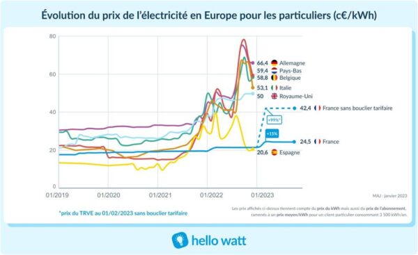 Mais les prix ont flambé en France et en Europe depuis 2021 ainsi que l’indique le tableau ci-dessous, contrairement aux Etats-Unis (cf. le graphique de l’EIA ci-dessus) :