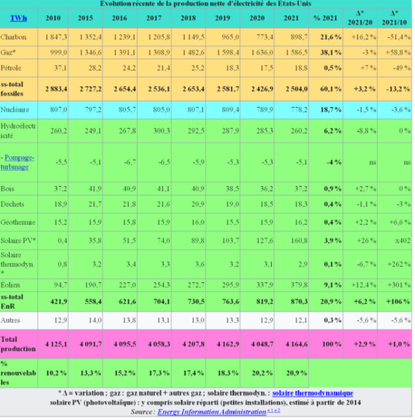 Le secteur de l’énergie électrique parvient néanmoins aux Etats-Unis à réduire sensiblement sa production carbonée, la production venant du charbon et du pétrole ayant baissé de 50% environ depuis 20 ans comme le montre le graphique ci-après :