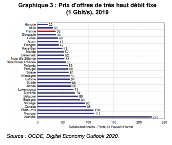 En 2019, comme le montre le graphique suivant, la France faisait ainsi partie des pays où le prix d’une offre de très haut débit fixe (35 € par mois) était le moins élevé :