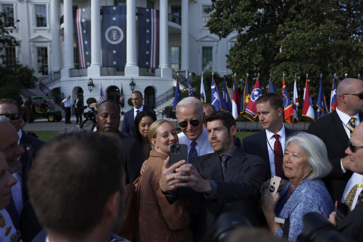 Le président Joe Biden avec des invités lors d’un événement célébrant l’adoption de la loi sur la réduction de l’inflation sur la pelouse sud de la Maison Blanche à Washington, le 13 septembre 2022. (Anna Moneymaker/Getty Images)