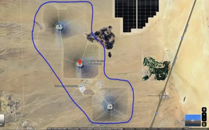 La centrale solaire d’Ivanpah (zone marquée) dans l’État américain de Californie, près de la frontière avec le Nevada. (Photo : Google Maps)
