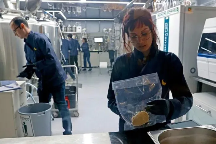 Une technicienne tient dans sa main un sachet scellé contenant de la viande de poulet cultivée en laboratoire, le 18 juin 2021, dans la ville israélienne de Ness Ziona. (Jack Guez/AFP via Getty Images)