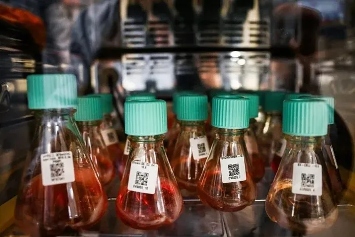 Une photo prise le 13 juin 2025 montre des flacons contenant de la graisse de porc cultivée, stockés dans le laboratoire de Hoxton Farm, une start-up spécialisée dans la culture de graisse de porc, à Londres. (Ben Stansall/AFP via Getty Images)