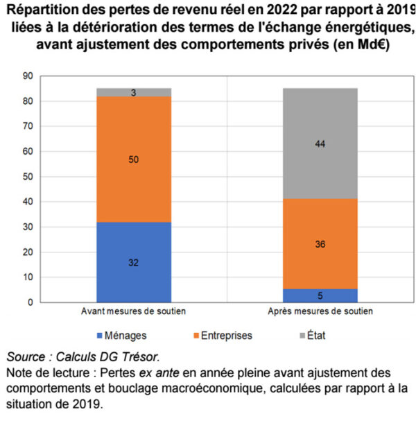 Concrètement, les aides déployées contribuent à compenser le choc énergétique presque en totalité pour les ménages et partiellement pour les entreprises, ainsi que l’illustre le tableau suivant :