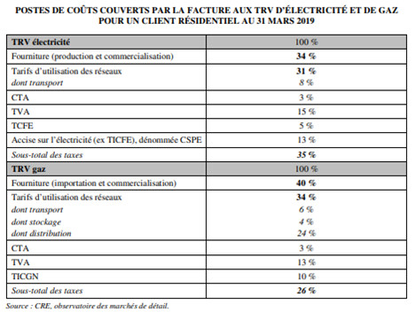 Cette intervention de l’État s’opère alors que le marché européen de l’électricité est très régulé et que l’ensemble des taxes sur l’électricité dépassait 35% de la facture du consommateur avant la crise (contre 26% pour le gaz). Elle se composait des taxes détaillées dans le tableau suivant, fourni par la commission des Affaires économiques de l’Assemblée nationale :