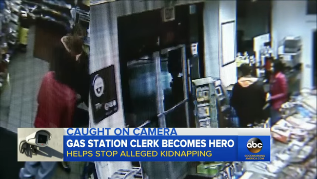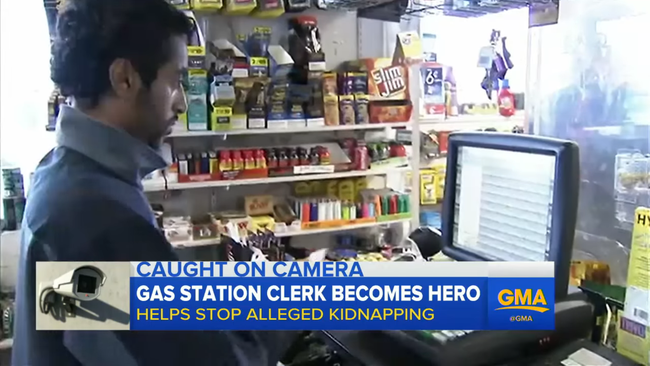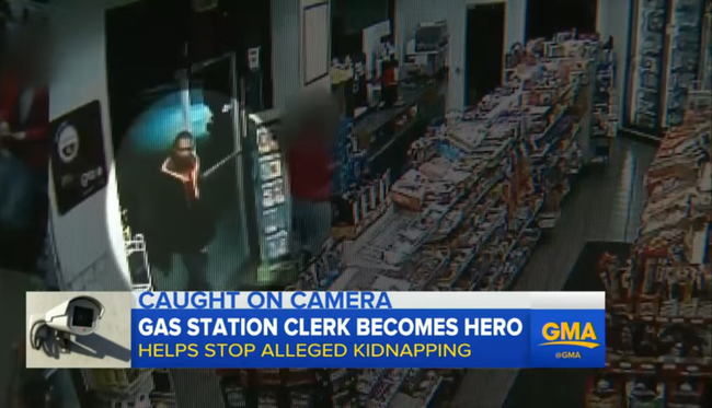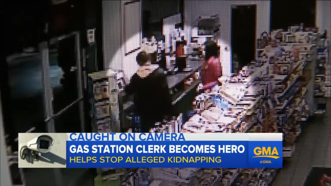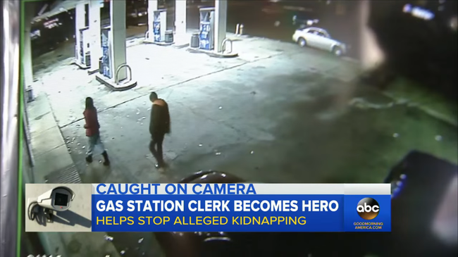 Le brave employé d’une station-service fait face à un kidnappeur armé. Il dit à la victime : « Restez derrière moi »
