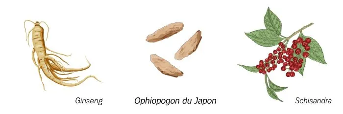 • Schisandra (Wu Wei Zi) : réduit la transpiration excessive, aidant ainsi à éviter la déshydratation et la perte de liquides corporels essentiels.