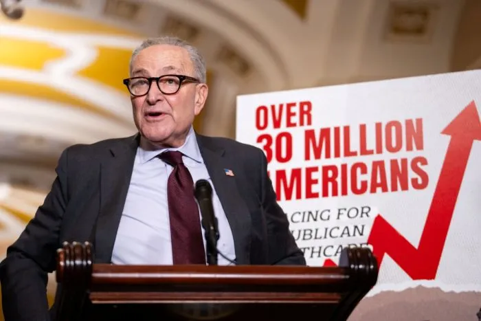 Le chef de la minorité au Sénat, Chuck Schumer (Démocrate de New York), s’exprime lors d’une conférence de presse hebdomadaire au Capitole à Washington, le 2 décembre 2025. (Madalina Kilroy/Epoch Times)
