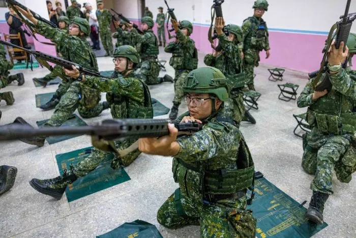 Des réservistes participent à un entraînement préalable au combat lors de la 41e édition des exercices militaires Han Kuang, à Miaoli, Taïwan, le 9 juillet 2025. (Annabelle Chih/Getty Images)
