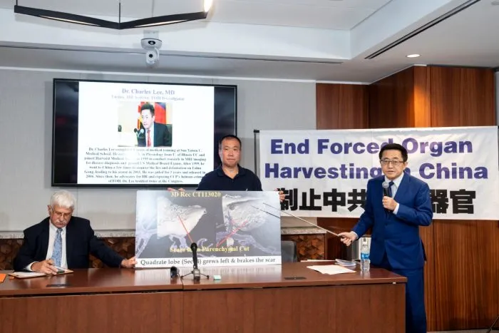 (De g. à dr.) Robert Destro, ancien secrétaire d’État adjoint aux droits de l’Homme, Cheng Peiming, pratiquant du Falun Gong victime d’un prélèvement d’organe en Chine, Dr. Charles Lee, enquêteur sur le trafic d’organes, lors d’une conférence à Washington, 9 août 2024. (Madalina Vasiliu/Epoch Times)