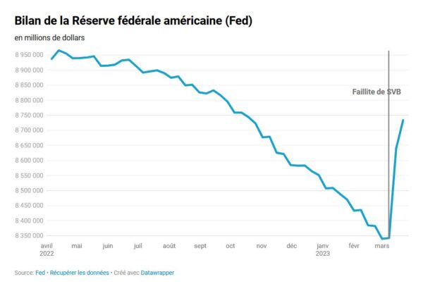 Néanmoins, beaucoup d’éléments plaident en faveur d’une appréciation du cours du bitcoin dans les prochains mois. Celui-ci pourrait enfin bénéficier d’un coup de pouce indirect des banques centrales. Face au risque de contagion de la faillite SVB, la Réserve fédérale américaine (Fed) a par exemple rapidement procédé à des rachats de titres, relançant son bilan à la hausse après des mois de dégrossissement.