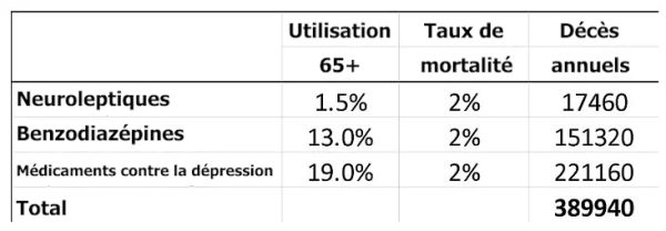 Les jeunes ont un risque de décès beaucoup plus faible que les personnes âgées, car ils tombent et se cassent la hanche rarement, c’est pourquoi je me suis concentrée sur les personnes âgées. J’ai essayé d’être prudent. Mon estimation ne tient pas compte de nombreux décès dus à la médication chez les personnes âgées de moins de 65 ans ; elle n’inclut que trois classes de médicaments psychiatriques ; et elle ne tient pas compte des décès survenus à l’hôpital.