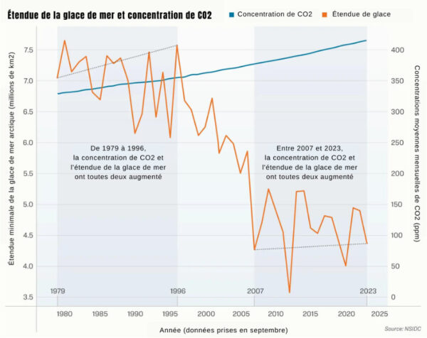 En septembre 2023 – l’année « de loin » la plus chaude des 174 années de données climatiques de la NOAA, selon la scientifique en chef de l’organisation Sarah Kapnick – le minimum annuel de glace de mer dans l’Arctique était de 1,69 million de miles carrés (4,38 millions de km carrés), soit une augmentation d’environ 40.000 miles carrés (103.000 km carrés) par rapport à 2007. La concentration de CO2 était de 421,55 ppm en 2023.