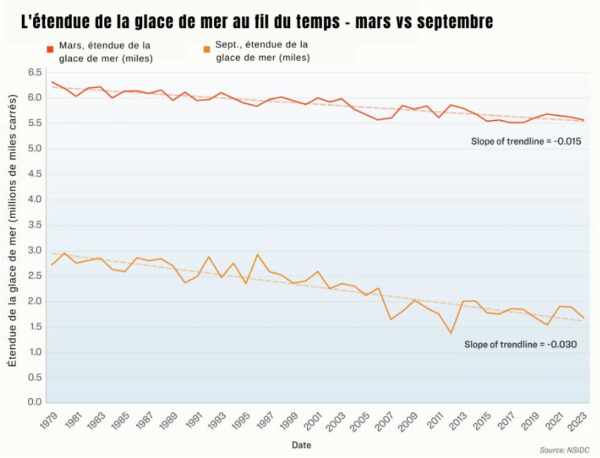 Sur un graphique, la diminution de l’étendue de la glace de mer entre 1979 et 2023, calculée sur la base des données plus précises de mars, est deux fois moins rapide (15.000 miles carrés ou 38.850 km carrés) que celle de septembre (30.000 miles carrés ou 77.700 km carrés).