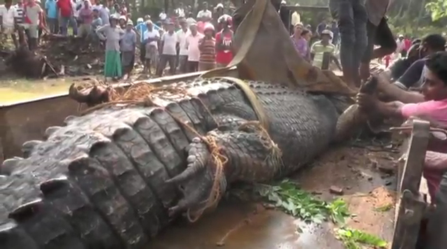 Des villageois utilisent une pelleteuse pour immobiliser un crocodile de 5 mètres avant de le relâcher dans l’étang