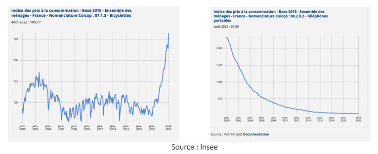 Cette manne financière déversée sur les vélos ne peut que produire ce que toute politique keynésienne a toujours produit, à savoir de l’inflation. Les courbes ci-dessous montrent l’évolution de l’indice des prix des bicyclettes – largement subventionnées par les pouvoirs publics comme nous l’avons montré – et l’évolution de l’indice des prix des téléphones portables – non subventionnés comme chacun sait. La comparaison se passe, nous semble-t-il de commentaires.