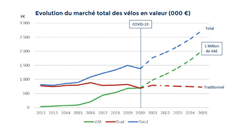 Avec 388 000 unités vendues en 2019 (+12 % par rapport à 2018), 515 000 en 2020 (+33 %) et 660 000 en 2021 (+28 %), le succès du vélo à assistance électrique ne se dément pas. S’il ne représente qu’un petit quart des ventes en volume, le VAE contribue, en revanche, à 60 % des ventes en valeur. Il faut dire qu’il coûte en moyenne 5 fois plus cher qu’un vélo dit « traditionnel ».