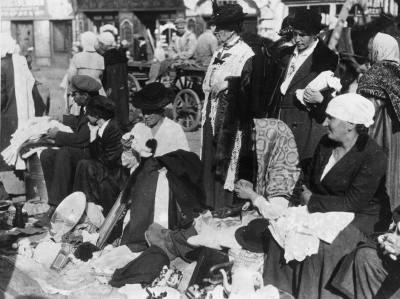 Des femmes essayant de vendre leurs biens, vêtements et objets de décoration, dans un marché de rue en octobre 1921, durant la famine russe de 1921-22. (Topical Press Agency/Getty Images)