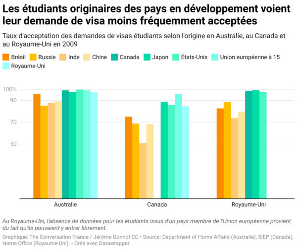 Les chiffres sont là pour témoigner des craintes des agents de l’immigration malgré les précautions administratives et les justificatifs exigés pour l’obtention d’un visa étudiant. En 2009, au Canada, le taux d’acceptation des demandes de titres de séjour était de 96% pour les étudiants provenant de l’Union européenne et de 86% pour ceux venant des États-Unis, contre respectivement 68 et 51% pour la Chine et l’Inde. Le constat est similaire en Australie et au Royaume-Uni, où le taux d’approbation des demandes de visa d’étudiants provenant des pays en développement était largement inférieur à celui des étudiants originaires de pays développés.