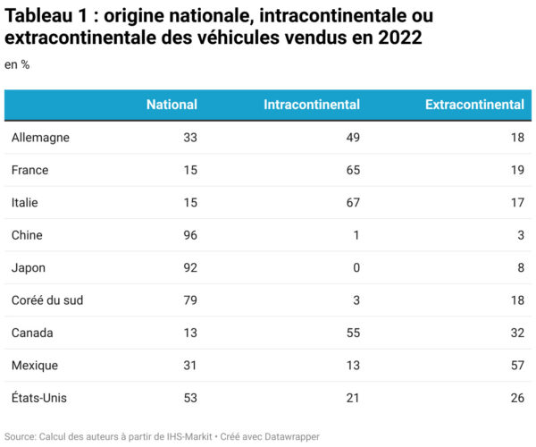 L’analyse des échanges mondiaux de véhicules montre en effet que les ventes de l’ensemble des grands pays se concentrent sur des véhicules produits dans la même grande région continentale : 82% des véhicules vendus en Allemagne, 83% en Italie et 81% en France proviennent du continent européen, y compris de Turquie (Tableau 1). En Asie, 82% (Corée du Sud) à 97% des véhicules (Chine) ont été assemblés en Asie, dont une large majorité dans le pays de consommation contrairement aux pays européens. En Amérique du Nord, près de 30% des véhicules vendus au Canada et aux États-Unis proviennent d’en dehors de l’Amérique du Nord.