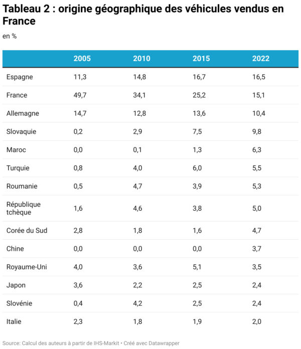 Pour la France en 2022, l’origine des véhicules vendus sur le territoire est d’abord locale et européenne (15% de France, 16% d’Espagne, 10% d’Allemagne, 10% de Slovaquie) et ensuite seulement extra-européenne (Tableau 2). En dehors de l’Union européenne (UE), on retrouve des véhicules originaires du Maroc (6,3%) et de Turquie (5,5%) et dans une moindre mesure du Royaume-Uni (3,5%), pays dans le pourtour de l’UE et ayant des accords commerciaux avec celle-ci qui assurent des barrières aux échanges faibles. Viennent ensuite seulement la Corée du Sud (4,7%), la Chine (3,7%) et le Japon (2,4%) aux neuvième, dixième et douzième places des pays d’origine.