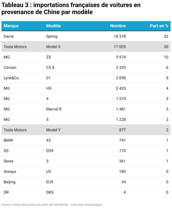 Pour l’instant, des batteries et des voitures électriques voyagent sur de longues distances, à l’image des importations européennes en provenance de Chine largement constituées de véhicules électriques et qui ont fortement augmenté ces derniers mois. En France, ces importations sont pour un tiers des véhicules Tesla et un autre tiers des Dacia Spring (tableau 3). Cela a cependant toutes les chances d’être temporaire, car ce type de véhicules et les batteries sont encore plus compliqués à transporter par bateau du fait de leur poids et des régulations liées au caractère dangereux de ces marchandises.