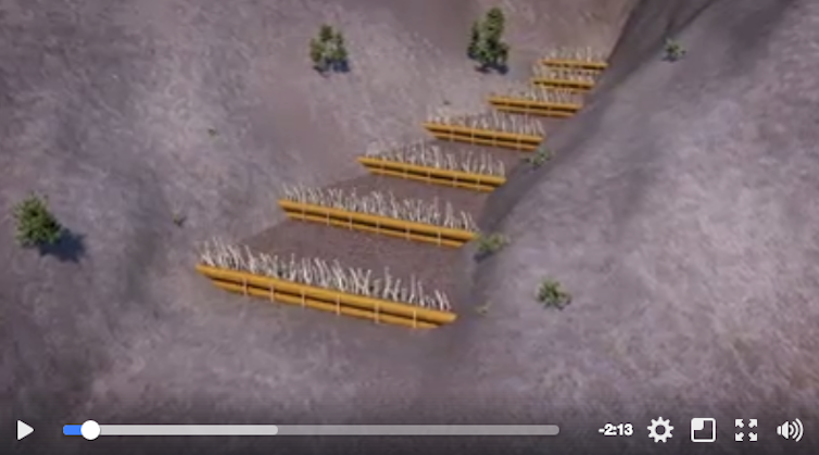 Ici, on utilise des ouvrages composés de seuils en bois : surmontés de boutures et de plants, ils sont installés dans des lits de ravines érodées à l’amont des bassins afin de retenir les sédiments fins et limiter les envasements de rivières (Durance et affluents) à l’aval. Plus de 2 000 ouvrages ont été construits depuis près de 15 ans à titre expérimental, dans divers sites du grand bassin de la Durance.