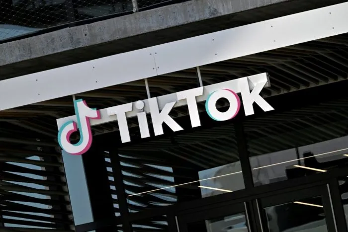 Le logo de TikTok devant les bureaux de la société à Culver City, Californie, le 4 avril 2025. (Robyn Beck/AFP via Getty Images)