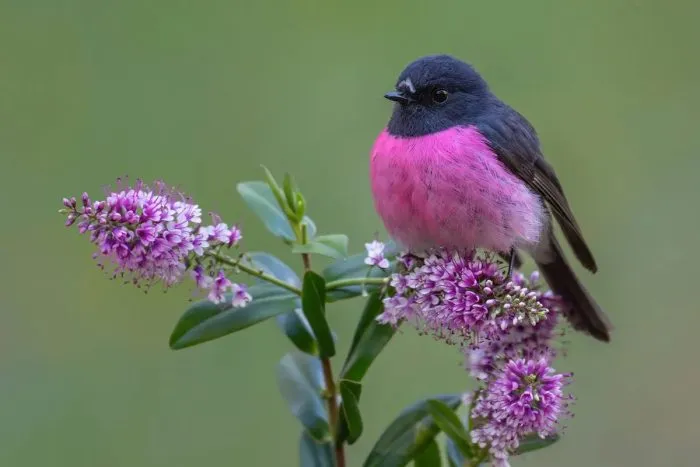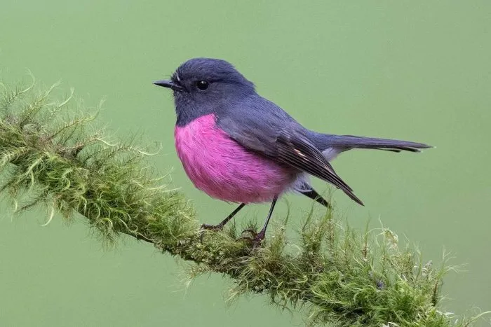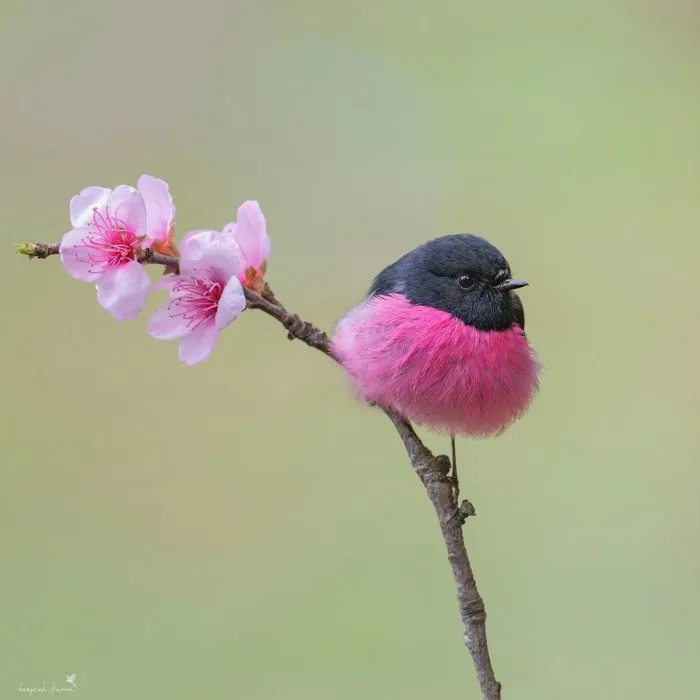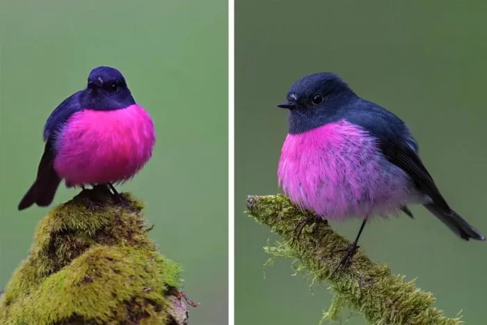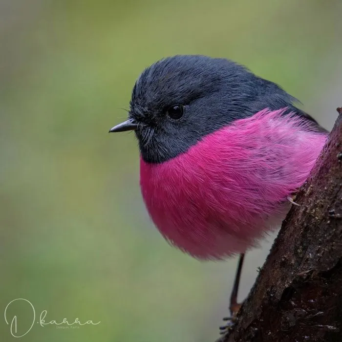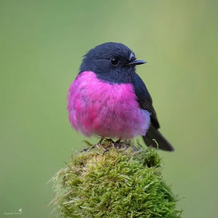 Alors que le rouge-gorge affiche des plumes ternes au-dessus d’un ventre rouille, il existe un autre passereau plus exotique, que l’on ne rencontre qu’en Victoria, en Nouvelle-Galles du Sud et en Tasmanie, et qui arbore une poitrine d’un rose éclatant. Cette touche de rose fluorescent tranche nettement avec sa tête, sa queue et son dos d’un noir lustré. Et sa silhouette ronde le rend adorables.
