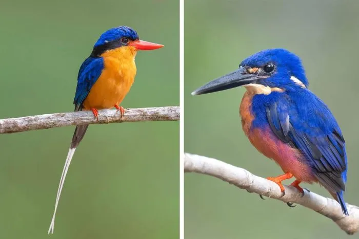 Un martin-pêcheur à poitrine fauve ; (à dr.) un martin-pêcheur azur. (Deepak Karra)