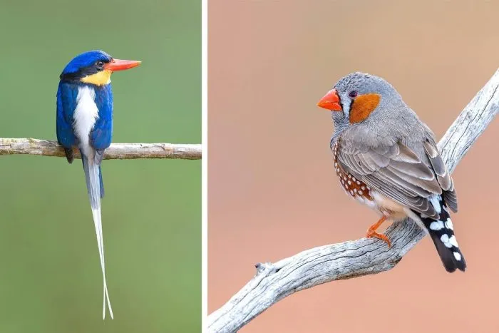 (À g.) un martin-pêcheur à poitrine fauve ; (à dr.) un diamant mandarin. (Deepak Karra)