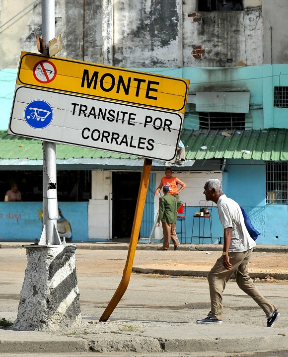 Un piéton près d’un panneau de signalisation à La Havane, le 11 janvier 2016. Les routes à Cuba sont en très mauvais état. (YAMIL LAGE/AFP/Getty Images)
