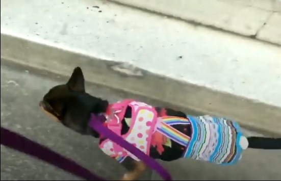 Regardez Victoria se promener en ville dans sa jolie tenue. Elle est si pleine de vie. C’est incroyable comme elle parvient à tenir sur ses pattes avant tout en agitant le bas de son corps sans arrêt dans les airs.