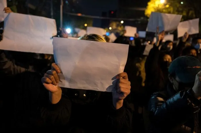 Des manifestants brandissent une feuille blanche contre la censure lors d’une marche contre les strictes mesures « zéro Covid » à Pékin, le 27 novembre 2022. (Kevin Frayer/Getty Images)