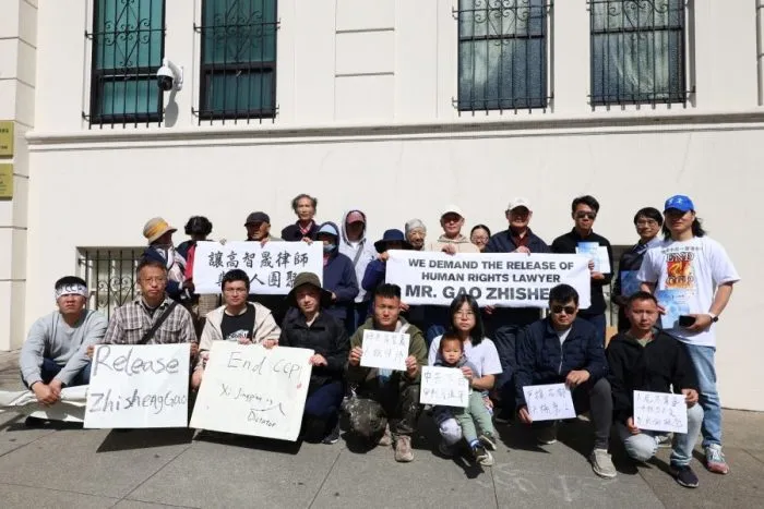 Des militants chinois manifestent devant le consulat de Chine à San Francisco pour le 61e anniversaire de l’avocat des droits humains porté disparu Gao Zhisheng. (Crystal Lu/Epoch Times)