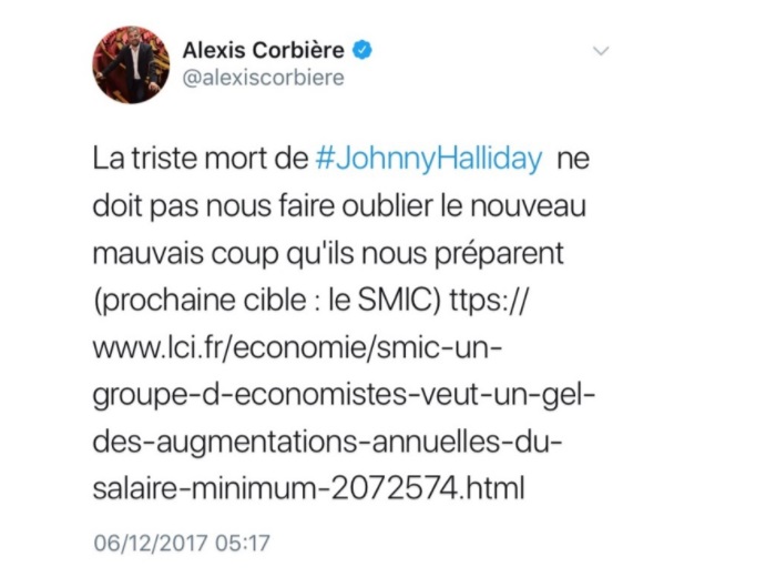 « La triste mort de #JohnnyHalliday ne doit pas nous faire oublier le nouveau mauvais coup qu’ils (le gouvernement, NDLR) nous préparent (prochaine cible : le SMIC) »