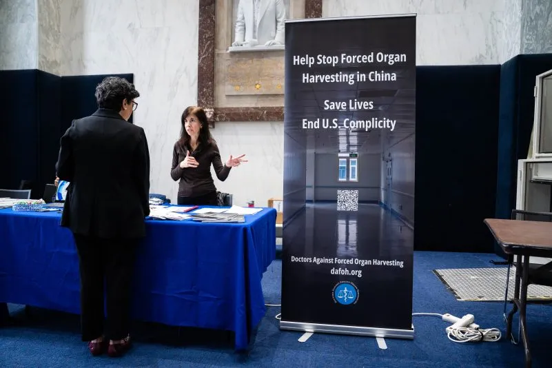 Le stand de l’organisation Doctors Against Forced Organ Harvesting lors du China Human Rights Fair, au Rayburn House Office Building du Capitole, à Washington, le 10 décembre 2025.
