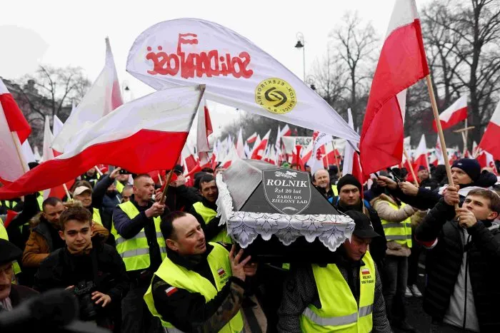 Des agriculteurs polonais portent un cercueil portant l’inscription « Agriculteur — 20 ans — tué par le Green Deal » lors d’une manifestation contre les mesures climatiques de l’UE et les importations ukrainiennes, le 6 mars 2024 à Varsovie (Pologne). (WOJTEK RADWANSKI/AFP via Getty Images)