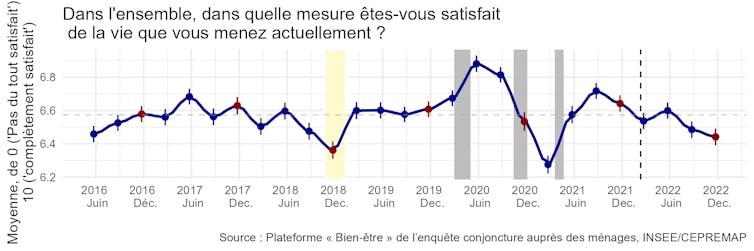 À la fin de l’an passé, les grandes dimensions du bien-être subjectif ont retrouvé ainsi des niveaux similaires à ceux enregistrés pendant la crise des « gilets jaunes ». Elles sont identifiées grâce à vingt questions invitant les enquêtés à donner des notes entre 0 et 10, par exemple, « dans quelle mesure êtes-vous satisfait de votre santé ? », 0 valant pour « pas du tout satisfait » et 10 pour « complètement satisfait ».