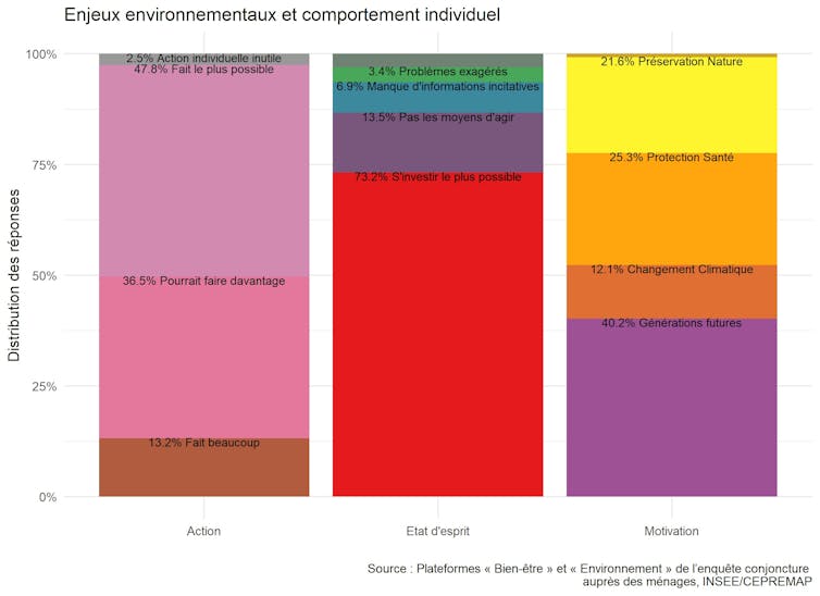 Les Français estiment très majoritairement (73,2%) que chacun doit s’investir le plus possible. Une part encore importante (13,5%) estime ne pas disposer des moyens nécessaires pour agir à son niveau. Ainsi, une grande majorité de la population est consciente et s’inquiète des problèmes environnementaux, désire fondamentalement agir mais trouve difficile d’en faire davantage.