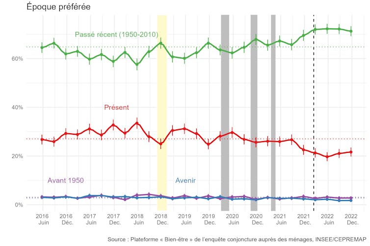 Comme nous l’avions relevé dans notre précédent baromètre qui portait sur l’année 2021, l’inquiétude face à l’avenir a pour contrepartie le repli vers le passé. Nous posons depuis le début de notre enquête la question suivante : « certaines personnes aimeraient bien vivre dans une autre époque en France. Si vous aviez le choix, laquelle choisiriez-vous ? ».