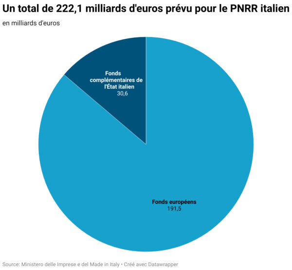 En 2021, l’Union européenne (UE) avait approuvé l’octroi de 191,5 milliards d’euros à l’Italie, qui a ajouté à ce montant 30,6 milliards d’euros par le biais d’un plan complémentaire, financé directement par l’État, pour un total de 222,1 milliards d’euros. Cette enveloppe est destinée à financer le piano nazionale di ricostruzione e resilienza (plan national de relance et de résilience, ou PNRR). Les sommes doivent être allouées d’ici cinq ans à différents projets dans des six domaines d’investissement (Innovation, transition verte, infrastructures, éducation, inclusion, santé).