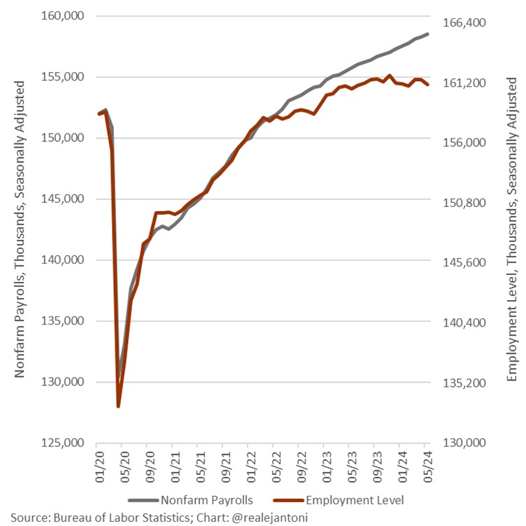 L’enquête auprès des établissements a toujours fait état d’une augmentation du nombre d’emplois au cours des trois dernières années. C’est le chiffre principal qui figure dans le rapport du BLS et dont tous les grands médias se font l’écho. En dessous, cependant, vous trouverez une enquête sur les ménages qui interroge les gens pour savoir s’ils ont un emploi et qui utilise des extrapolations statistiques conventionnelles pour discerner l’ensemble de la situation.