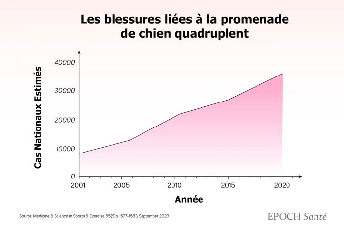 Les visites aux urgences pour des blessures liées aux promenades de chiens chez les adultes ont quadruplé entre 2001 et 2020 aux États-Unis, selon une étude initiée par le Dr Edward McFarland, chirurgien de l’épaule. Il n’y a pas de données actuelles indiquant une hausse généralisée récente des blessures liées aux promenades des chiens en France, mais plutôt une reconnaissance d’un risque persistant qui nécessite vigilance et prévention.