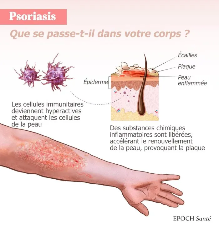 Dans le psoriasis, l’hyperactivité des cellules immunitaires déclenche une inflammation et un renouvellement rapide des cellules cutanées, ce qui entraîne la formation de plaques épaisses et squameuses à la surface de la peau. (Illustration : Epoch Times, Shutterstock)