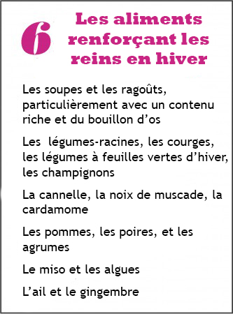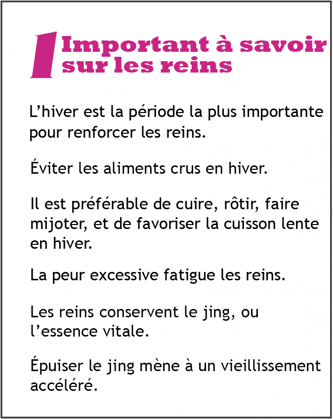 L’hiver est la saison associée aux reins dans la médecine chinoise car l’hiver nous enseigne l’importance de conserver notre énergie. Contrairement à la chaleur et à l’abondance du printemps et de l’été, l’hiver est froid et rigoureux, et les ressources sont maigres. Si nous avons assez de jing lorsqu’une période difficile arrive, nous pouvons rebondir. Cependant, si notre jing est faible et que le stress commence à piocher dans nos réserves, le rétablissement est plus difficile et les signes de l’âge commencent à se montrer. Les symptômes typiques du vieil âge – la fatigue, la perte de cheveux, un dos douloureux et de faibles os – sont également les signes d’un jing réduit.